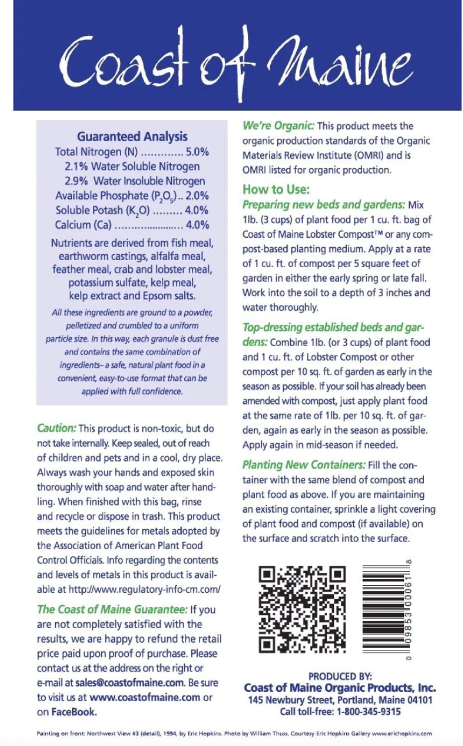 Coast of Maine Stonington Blend Grower’s Mix is a complex “super soil” designed for high performance container growing. It works well with tomatoes, and, where growing cannabis and medical marijuana is legal, growers have reported tremendous results. Rich in nutrients and formulated with amendments designed to boost budding, blooming, and root development, Stonington Blend™ also provides the ideal balance between water retention, soil texture, drainage and aeration in a consistent growing medium. This soil incorporates mycorrhizal fungi, kelp, fish bone and alfalfa meal, as well as worm castings, peat, coir and lobster compost. On its own, it is enough to feed a single cannabis plant through a full grow cycle in a 15-gallon pot. Just add water! There is no need for expensive nutrients. This blend will save you time and money and give you tremendous results!